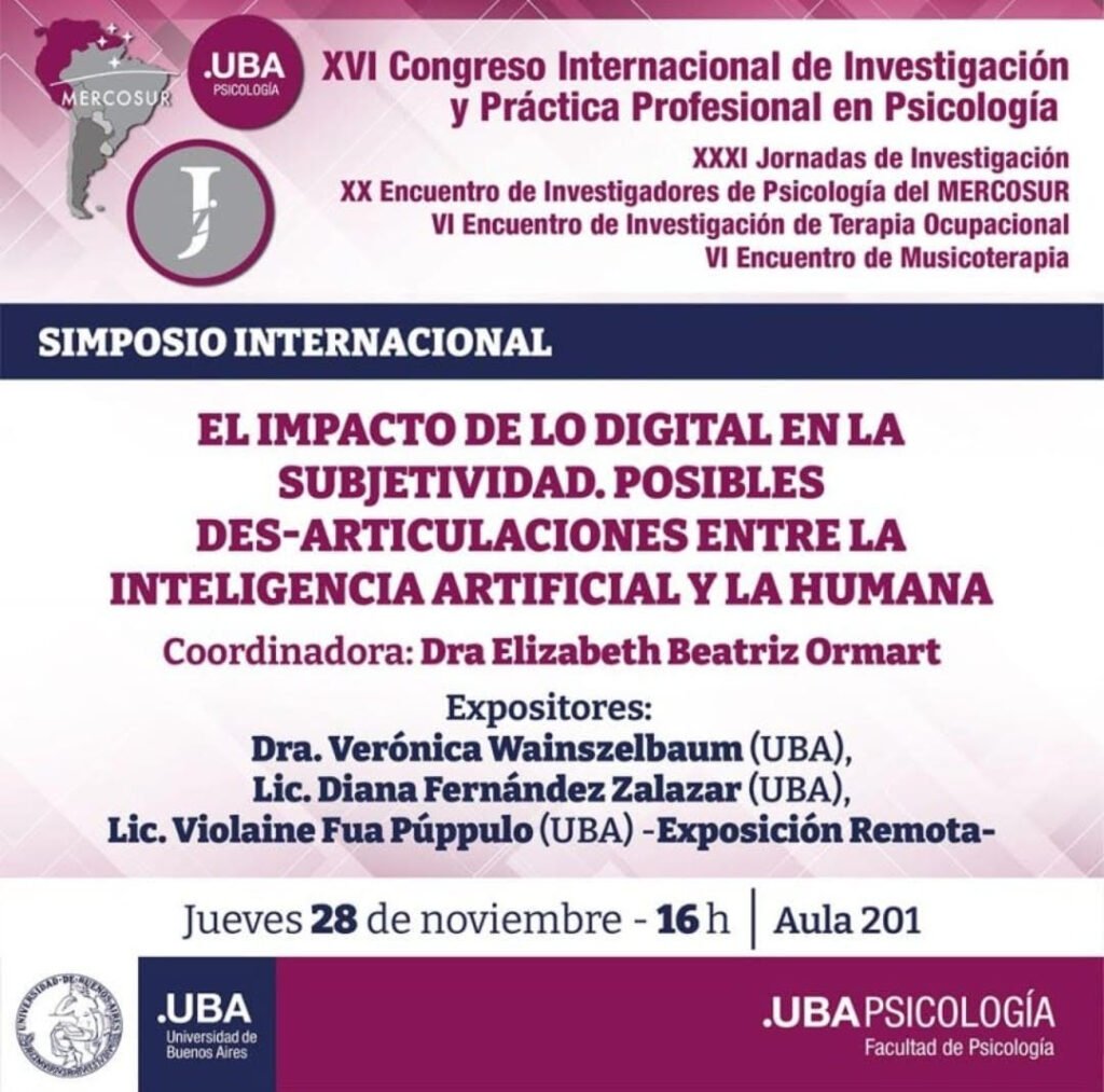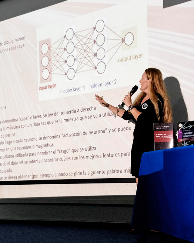 Invitada a hablar sobre las vinculaciones entre el Psicoanálisis y la Inteligencia Artificial, por la psicoanalista Ester Migrabi. El encuentro se celebró en la Biblioteca Nacional « Mariano Moreno » de la Ciudad de Buenos Aires, Argentina