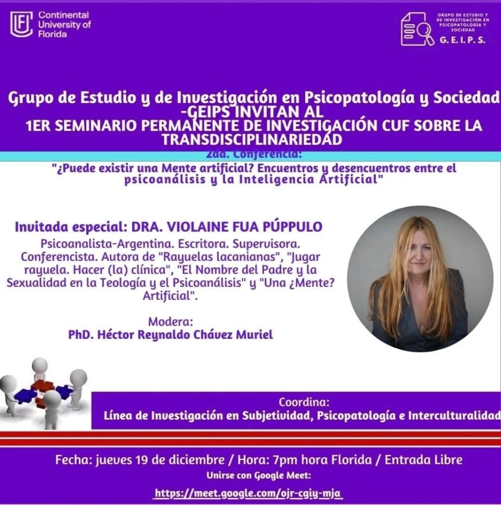 Me invitaron a hablar sobre los Encuentros y Desencuentros entre el Psicoanálisis y la Inteligencia Artificial, en el marco del Primer Seminario Permanente de Investigación sobre la Transdisciplinariedad. Fue un encuentro fructífero al que asistieron personas de distintos países.